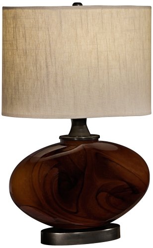 This captivating handmade table lamp features a base of triple-layered hand-blown glass with a deep amber backswirl design throughout. The fixture is topped by an oval linen hardback shade. Includes a decorative lamp cord accessory displaying the Thumprints logo and designer's signature. Due to the handmade nature, no two lamps are exactly alike and each is a unique piece of art.